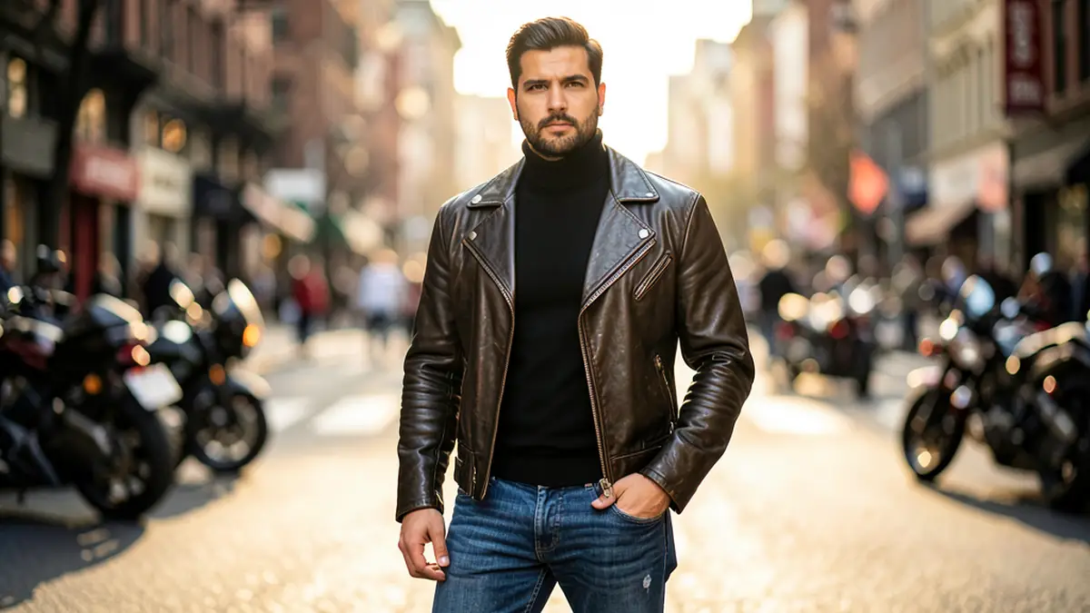 Внешний вид — это язык без слов. Комбинация джинсов, водолазки и кожаной куртки — классический «универсальный» комплект, который сочетает утилитарность и эстетику. Он работает и на дороге, и в городской среде, сочетая защитные свойства кожаной куртки и комфорт джинсов с сдержанной элегантностью водолазки.