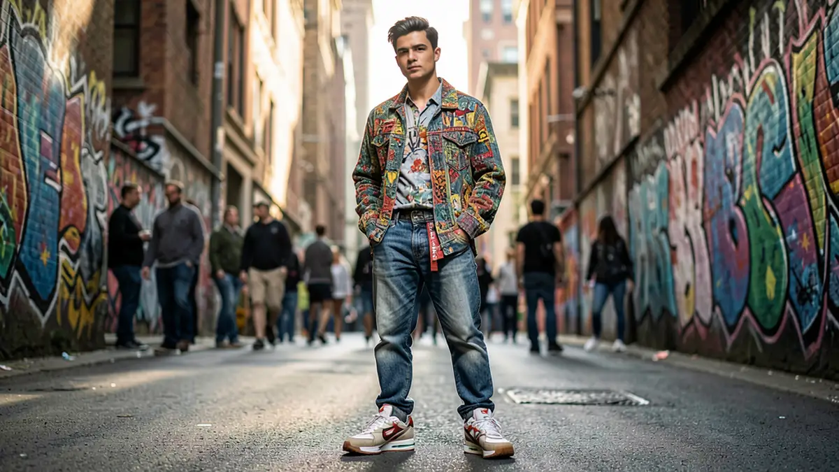 - Уличная эстетика: потертые джинсы, oversized футболка, клетчатая рубашка и винтажные Air Max 95 — съёмка ночью с неоновыми вывесками.