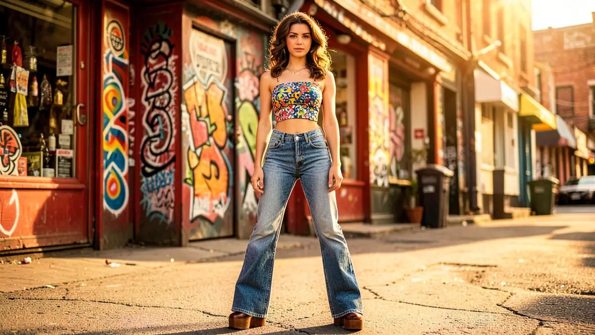 Ключ к успеху — пропорции. Джинсы-клеш должны сидеть плотно в бёдрах и расширяться от колена вниз, создавая плавную линию. Вариации включают мини-клеш, обычный клеш и супер-клеш. Материалы — от классического денима до бархата и велюра для вечернего образа.