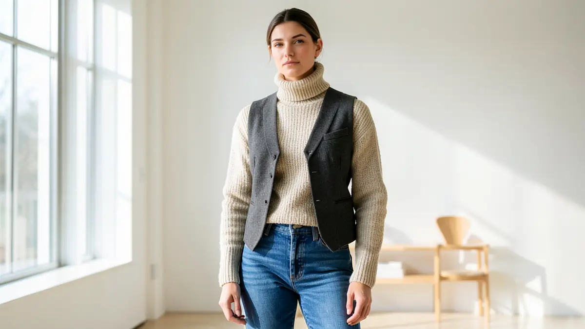 Автор советует: инвестировать в две пары джинсов (тёмные и светлые), одну высококачественную водолазку и один универсальный жилет — этого достаточно, чтобы собрать множество образов и сократить гардероб без потери стиля.