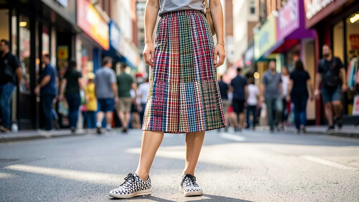 - Кейc 2 — уличный стиль: молодой человек носит кроссовки с крупной клеткой и юбку-мини с микроклеткой (или брюки в мелкую клетку). Эффект: динамика и визуальная игра, подходящая для мероприятий и прогулок.