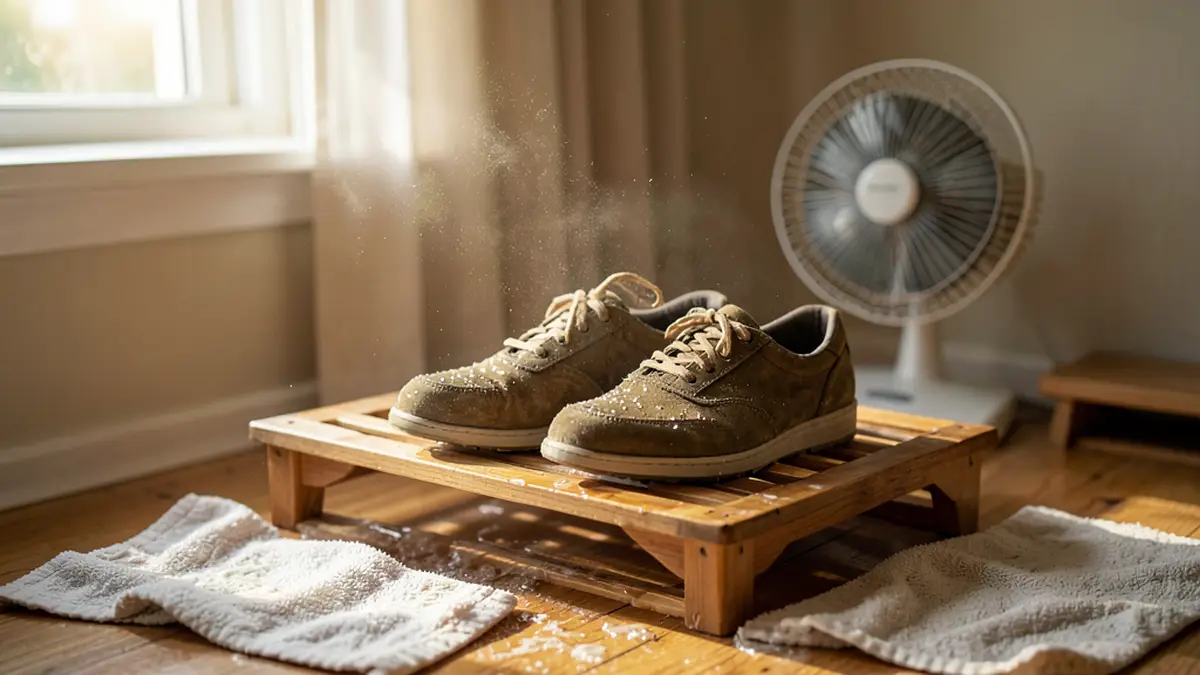 Мужчина шел по дождю и вернулся с сырыми кроссовками. Он быстро промокнул поверхность полотенцем, вынул стельки и набил обувь бумагой. Поставил на подоконник вдали от прямых лучей — через сутки обувь была сухая и после расчесывания щеткой вернула прежний вид. Этот способ — классический и безопасный для городских ситуаций.