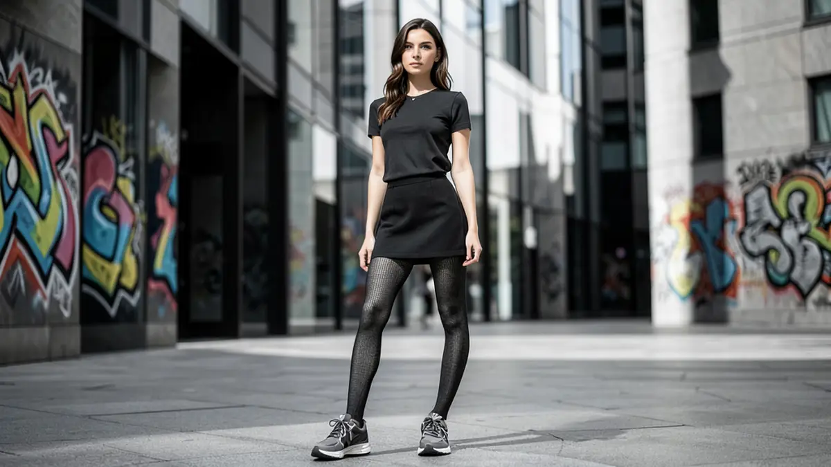 В одном из стритстайл-репортажей девушка сочетала короткую джинсовую юбку с плотными чёрными колготками и матовыми чёрными кроссовками — результат: аккуратный, сдержанный образ, который выглядел дороже, чем отдельные предметы гардероба. В другом примере блогер создала эффект «петли» — бледно-бежевые колготки и однотонные кроссовки в тон с сумкой и ремнём — получилось визуально длиннее и гармоничнее.