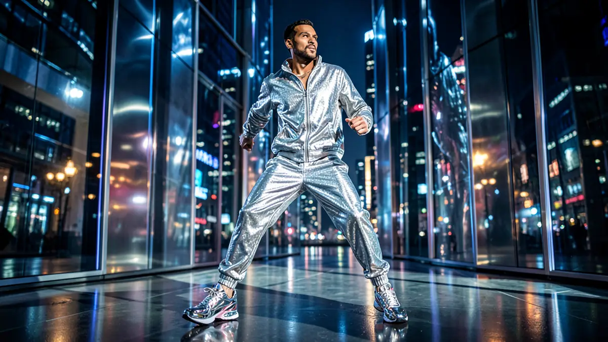 В одном популярном салоне стилист предложил клиенту комбинацию: матовый серебристый костюм, кроссовки с хромированными вставками и небольшая прозрачная сумка. Фотосессия прошла в вечернем городе с подсветкой — светоотражающие элементы усилили динамику кадра, и результат оказался востребован на сториз и в лукбуках.