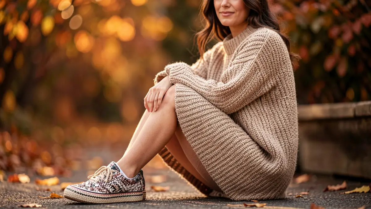 Автор советует: при создании уютного образа с шерстяным платьем‑свитером выбирать вязаные кроссовки нейтральных оттенков и уделять внимание слоям — лёгкий кардиган или пальто создадут завершённую, гармоничную композицию, а правильный уход продлит срок службы вещей.