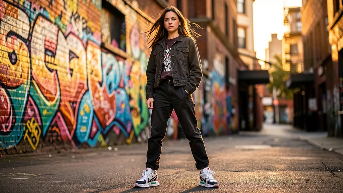 - Следите за цветовым сочетанием — например, повторяйте цвет кроссовок в деталях одежды.