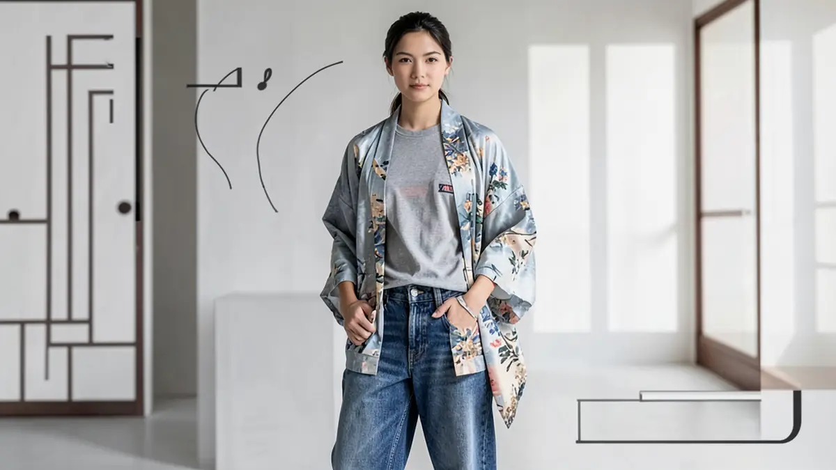 В последние годы концепция минимализма в азиатской моде (часто воспринимаемая через призму японского и корейского стилей) обратила внимание на простые, но выразительные комбинации. Одно из таких сочетаний — джинсы‑бойфренды + майка + кимоно — объединяет расслабленную мужскую форму, базовую повседневность и элегантный элемент вертикали кимоно. В результате получается ансамбль, который одновременно удобен, универсален и визуально интересен.