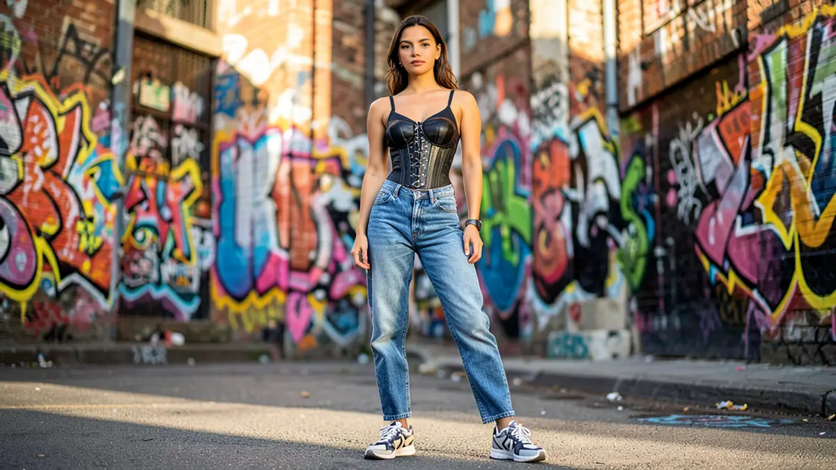 Собрать образ можно как бюджетно, так и премиально. Базовый комплект (пара джинсов-мом, недорогой корсет, базовые кроссовки) — в пределах средней цены ремесленных товаров в масс-маркете. Инвестиции в качественные вещи (корсет из плотной ткани, премиум-деним, брендовые кроссовки) окупаются долговечностью и внешним видом.