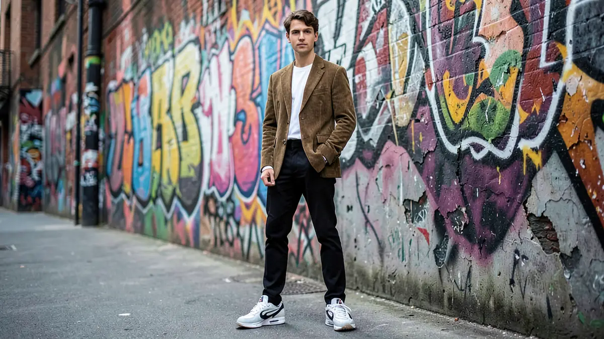 - Креативная встреча: темный блейзер, рубашка с тонким воротничком, контрастные кроссовки — баланс между деловым и неформальным.